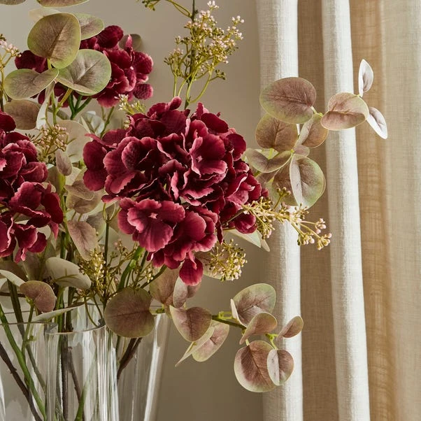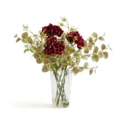 Stunningly displayed, this arrangement contains a mixture of realistic artificial flowers, including burgundy coloured Hydrangeas and fresh green Eucalyptus. Stems are fixed inside a beautiful clear glass handkerchief vase. Fantastic for an all year round display. There’s no need for any maintenance, simply wipe clean with a soft cloth!