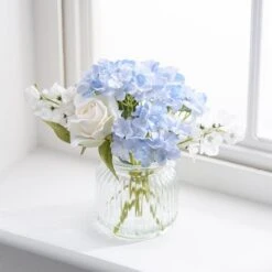 Enliven your home with the charm of our Artificial Hydrangea and Rose Bouquet in a Ribbed Glass Vase. The combination of blue hydrangeas and white roses, meticulously arranged in a clear ribbed vase, offers a highly realistic finish. With detailed leaves and intricate colouring, this maintenance-free arrangement is a perfect way to brighten your home, ensuring a lasting allure throughout the year.
