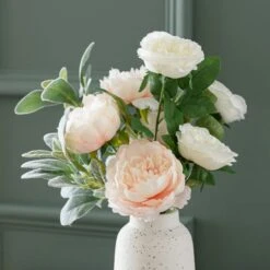 Infuse your home with the beauty of our Artificial Peony and Rose Bouquet in a Cream Ceramic Vase. The beautiful white and pink peonies and roses, displayed in a ceramic vase, offer a detailed and realistic finish. Ideal for display anywhere in your home, this arrangement requires no maintenance, ensuring lasting allure.