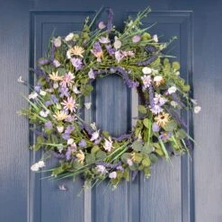 - Artificial wreath features daisies, lavender, eucalyptus