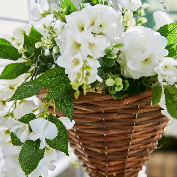 Opt for the chic Artificial White Floral Brown Rattan Hanging Basket for this Spring, where pure white blooms dance in a brown rattan cone for a timeless touch. Requiring no upkeep, it leaves you more time to savour the beauty.