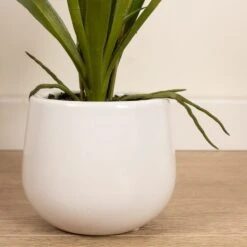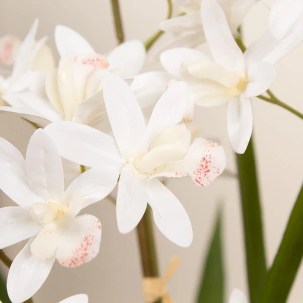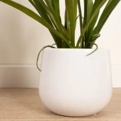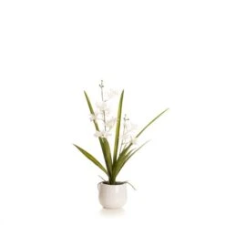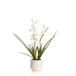 This stunning white orchid with it’s real-touch petals and dramatic long leaves sits inside a white ceramic plant pot. It would make a lovely centrepiece on a coffee table or sideboard.