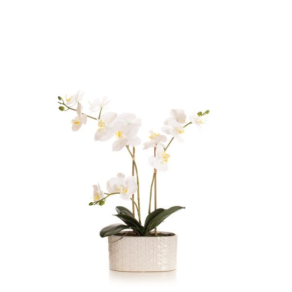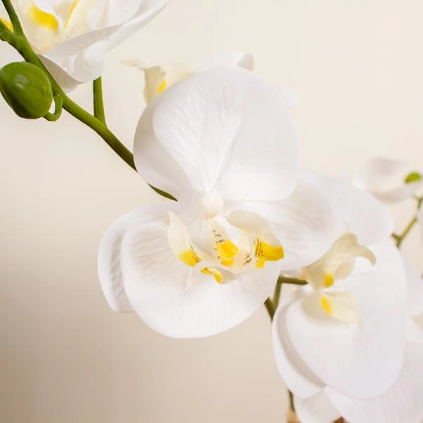 This stunning white orchid with its real-touch petals and leaves sits inside a beige oval textured ceramic pot. It would make a lovely centrepiece on a coffee table or sideboard, with the slim pot ideal for thinner surfaces.