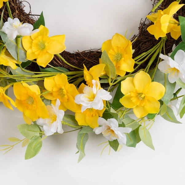 Add a splash of sunshine to your home with this artificial daffodil wreath in bright yellow and white. Ideal for adding a fresh, springtime feel, its vibrant colours will instantly lift any space. Whether hanging on your front door, displayed on a wall, or used as a centrepiece for seasonal celebrations, this wreath brings classic design to brighten your home year after year, with minimal upkeep. Perfect for creating a warm, inviting atmosphere for guests, this wreath is a seasonal essential. Just remember to bring it indoors during bad weather to keep it looking its best.
