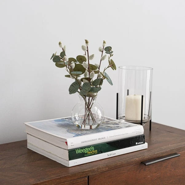 This elegant eucalyptus and pussy willow arrangement in glass vase, will bring a natural and contemporary design to any room of the house. The clear glass vase features an elegant rounded shape, ideal for display on shelves, sideboards, and tables. This low maintenance product will bring the outside in, without the hassle!