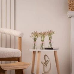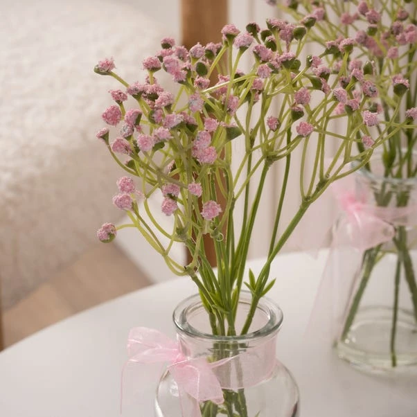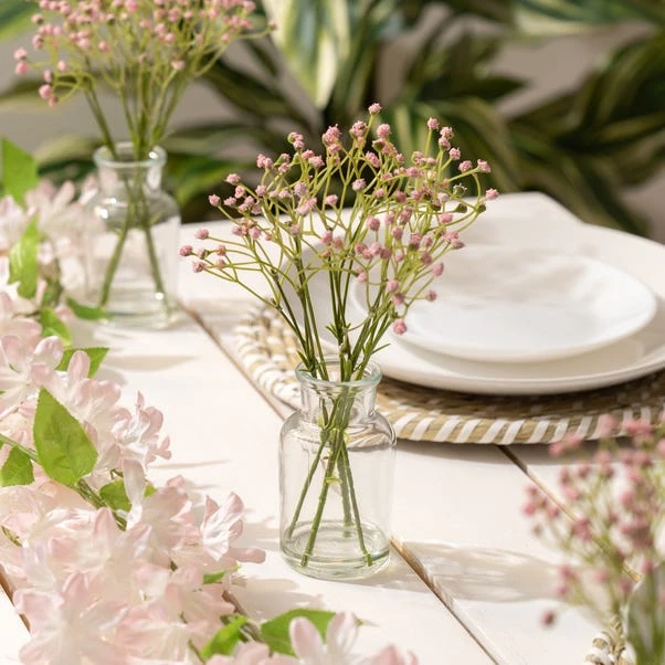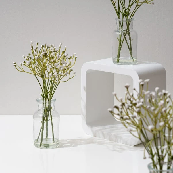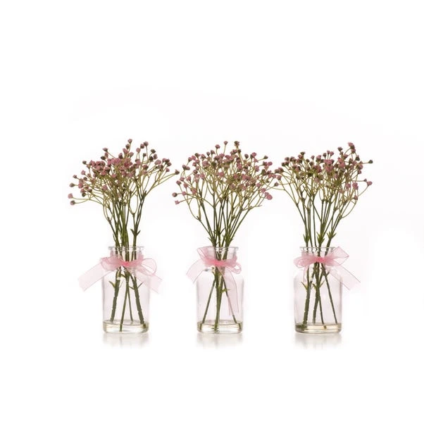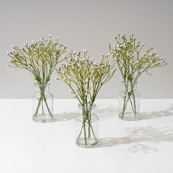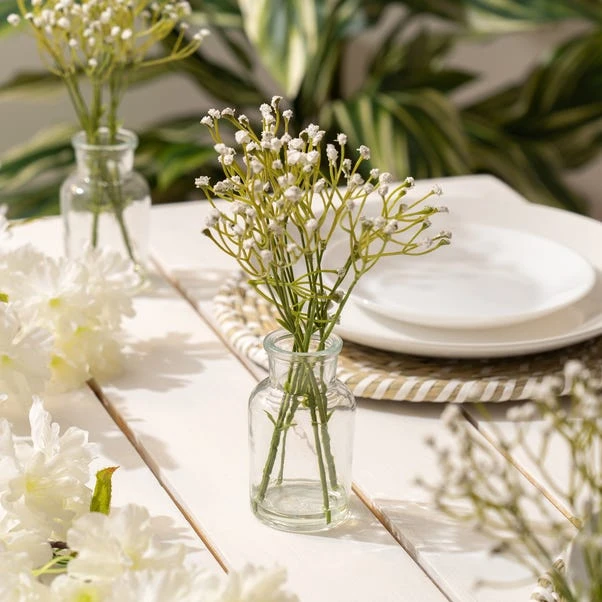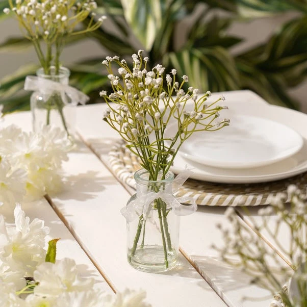 This Set of 3 Artificial Gypsophila Bundles in Glass Bottle Vases adds a touch of charm to any occasion. Ideal for table centres or as DIY wedding décor, these petite vases bring a delicate beauty to your setting.
