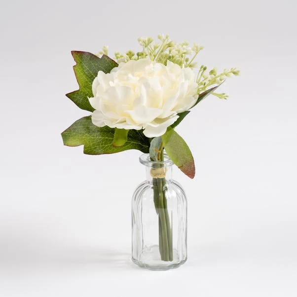 Bring timeless elegance to any setting with this set of 6 artificial peony and gypsophila posies in mini ribbed glass vases. Carefully designed to add a sophisticated touch, they’re the perfect size for shelves, desks or windowsills, enhancing your space without overwhelming it. Whether for your home, office, wedding or special event, these posies bring subtle beauty to any occasion. They also make a lovely gift or can be dressed up with hessian ribbon for a charming rustic twist.